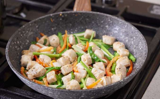 3. В конце закинуть к курице половинки помидоров черри и лапшу с небольшим количеством воды, в которой варилась. Всё хорошенько перемешать на среднем нагреве, добавить щепотку соли и снять с нагрева. Сервировка: На порционную тарелку переложить порцию лапши с соусом и курицей.Просто Кухня рецепты с 2020-2022