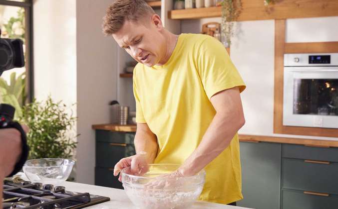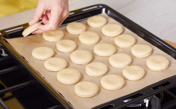 2. Пересыпать сухие ингредиенты в жидкие и хорошенько перемешать, а затем замесить тесто руками. Переложить тесто в пищевой пакет и оставить на 15 минут. Совет от шефа: Дать тесту настояться в течение 15 минут, чтобы клейковина заработала и тесто стало более эластичное На пергаменте раскатать тесто в пласт около 1 см толщиной и вырезать с помощью стакана кружки небольшого диаметра (около 6 см).
