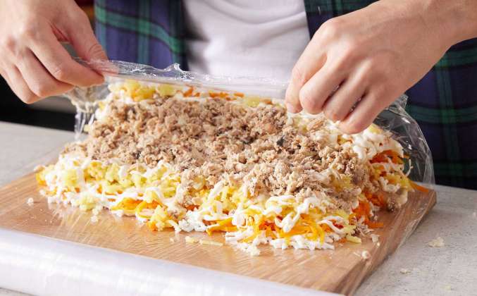 3. С помощью пищевой плёнки завернуть край и скрутить в рулет, затем разровнять и спрессовать слегка края рулета в пищевой плёнке и отправить в холодильник на 2-3 часа. Зафиксированный рулет переложить на продолговатую тарелку, аккуратно развернув из пищевой плёнки.