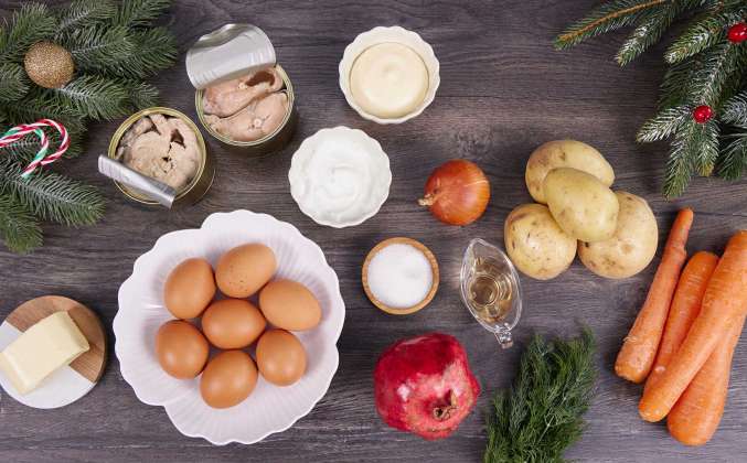 1. В фольгу по 2 штуки завернуть овощи, отправить в духовку и запекать при 180 градусах до готовности примерно 40-45 минут. Остудить, развернуть и очистить от шкурок. Натереть на крупной тёрке морковь и картофель. Отварить вкрутую яйца, остудить и очистить. Разъединить яйца на белки и желтки, натереть белки на крупной тёрке. Желтки оставить для украшения. Лук мелко нарезать и залить кипятком на пару минут, слить и отжать воду от лука через сито и переложить в миску. Добавить яблочный уксус и сахар, перемешать.