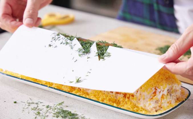 4. Сверху посыпать мелко натёртым желтком (5 шт.). Положить на центр рулета бумажный трафарет в виде ёлки (три треугольника) и выложить рисунок маленькими веточками укропа. Убрать трафарет, оставив рисунок в виде ёлки из укропа. Выложить «шарики» с помощью гранатных зёрен.Просто Кухня рецепты с 2020-2022