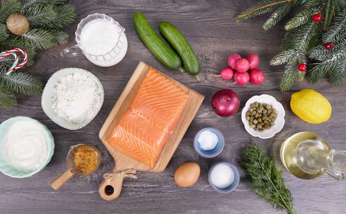 2. Форель нарезать мелким кубиком и переложить в миску. Огурцы очистить от шкурки и нарезать мелким кубиком и переложить к форели. Мелко нарезать красный лук и редис, отправить к рыбе. Каперсы нарезать средними кусочками и отправить ко всем ингредиентам, перемешать. Соус: Смешать сметану с горчицей.