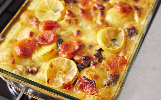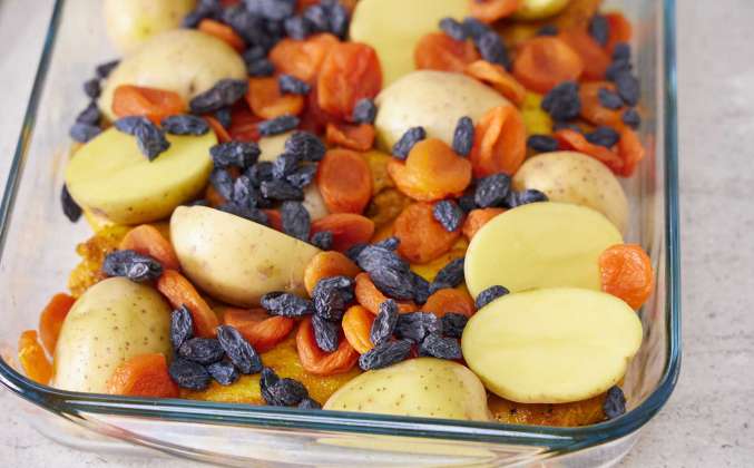 2. Курагу, изюм и очищенный миндаль добавить к курице, равномерно распределив по поверхности между курицей и картофелем. Нарезать лимон на кружочки средней толщины (оставить попки) и выложить на курицу. В сотейнике растопить 50 г сливочного масла, добавить муку (3 ст. л.) и активно перемешать на медленном нагреве до запаха «калёного ореха». Затем добавить гвоздику, бадьян и палочку корицы и продолжить замешивать тесто на медленном нагреве.