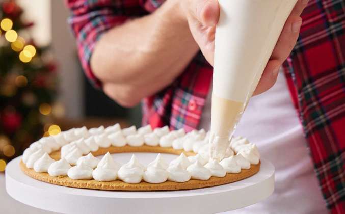 4. Сборка торта: На тортовницу или плоский поднос для торта переложить самый тяжёлый корж-кольцо и с помощью кондитерского пакета отсадить маленькие луковки из крема плотно друг к другу, двигаясь по большому краю по кругу, затем линию по краю у центра и третью линию отсадить в середине одной сплошной полосой между двух рядов по краям. Совет от шефа: Если крем становится жидким, убирайте его шаг за шагом в холодильник, чтобы он слегка застывал Затем положить сверху второй корж, не надавливая и отсадить таким же образом, «луковки» на корже.