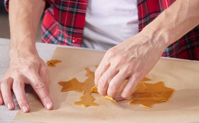 3. С помощью новогодних формочек (ёлочка и звёздочка) вырезать заготовки для печенья. Переложить на противень и отправить в духовку на 5-6 минут на 180 градусов. Крем: В миске смешать венчиком сметану и сахарную пудру. Совет от шефа: Сметану с сахарной пудрой перемешать не быстро, но равномерно, чтобы сметана не стала слишком жидкой Затем добавить к сметане порциями сливочный сыр и перемешать венчиком до однородной текстуры. Переложить крем в кондитерский пакет с насадкой и отрезать кончик.