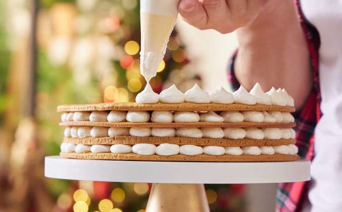 5. Таким образом собрать весь торт, отсадив на финальном корже красивые «луковки» в три ряда. Отправить торт в холодильник на несколько часов. Сервировка: Украсить торт пряничными звёздочками и ёлочками, и парочкой целых кумкватов с листочками. Кумкваты нарезать толстыми кружочками и украсить торт. Украсить клюквой и маленькими веточками розмарина. А сверху натереть оставшееся печенье на мелкой тёрке.Просто Кухня рецепты с 2020-2022