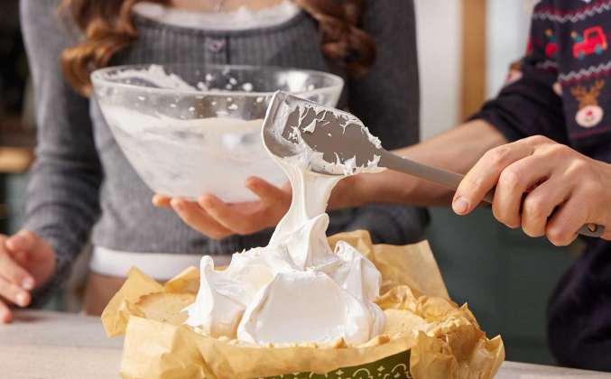 5. В отдельной миске соединить три белка с щепоткой соли и несколькими каплями лимонного сока, взбить миксером до пышности и увеличения объёма. Продолжая взбивание, тонкой струёй влить горячий сироп, доводя массу до плотной, устойчивой и глянцевой текстуры. Готовую меренгу распределить поверх охлаждённого пирога с помощью силиконовой лопатки, формируя мягкие волны. Подрумянить поверхность при помощи газовой горелки либо в духовке на режиме «гриль». Аккуратно извлечь пирог из формы и переложить на сервировочное блюдо.Просто Кухня рецепты с 2020-2022