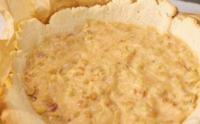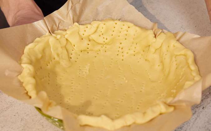3. Вернуть сотейник на слабый огонь буквально на минуту, периодически снимая с плиты, чтобы желтки равномерно заварились и не свернулись. Довести крем до полной однородности. Переложить начинку в отдельную ёмкость, накрыть плёнкой «в контакт» и убрать в холодильник до полного охлаждения и уплотнения. Охлаждённое тесто раскатать на листе пергамента в тонкий пласт, диаметр которого немного превышает размер формы с учётом будущих бортиков. Перенести тесто вместе с пергаментом в форму, аккуратно распределить по дну и сформировать края, слегка выступающие за пределы борта.