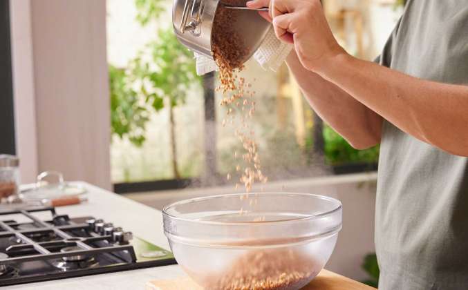 1. В кастрюлю пересыпать гречку и залить водой 300 г к 500 мл. На среднем нагреве довести до кипения, накрыть крышкой и оставить на 8-10 минут, чтобы набухла и дошла до «аль денте». Переложить гречку в большое блюдо остывать. Кабачок нарезать средним кубиком и слегка обжарить на разогретом подсолнечном масле (20 мл).