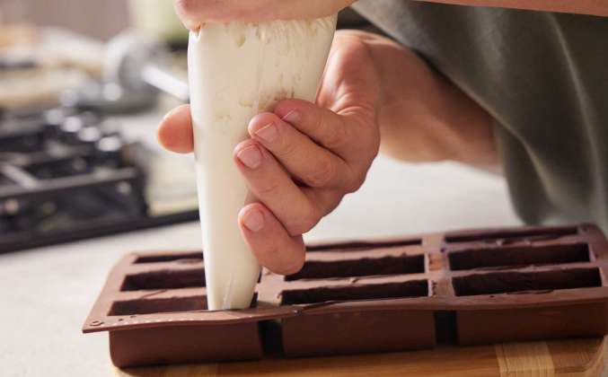 3. Затем отсадить тонкую полоску из варёной сгущёнки в центр каждой творожной палочки, углубив кончик кондитерского мешка в творожную массу. Покрыть творожной массой сверху и равномерно сгладить массу сверху лопаткой. Подогреть повторно шоколад на водяной бани, покрыть сверху 4 сырка, а остальные оставить с творожным дном. Отправить формочки с сырками в морозилку минимум на 1 час.Просто Кухня рецепты с 2020-2022