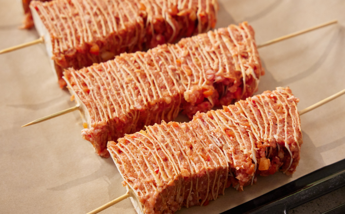 3. Перенести каждую шпажку на вторую половину стопки, проткнуть и также разрезать как первую стопку со шпажками. Переложить 6 длинных шашлычков на шпажках на противень, застеленный пергаментом. Отправить в заранее разогретую до 180 градусов духовку на 25 минут. Заправка-соус: В сотейник отправить сливочное масло и измельчённый чеснок, растопить на минимальном нагреве.