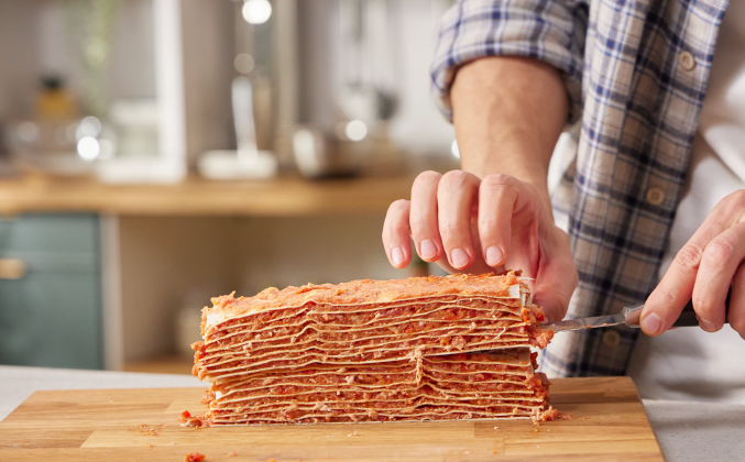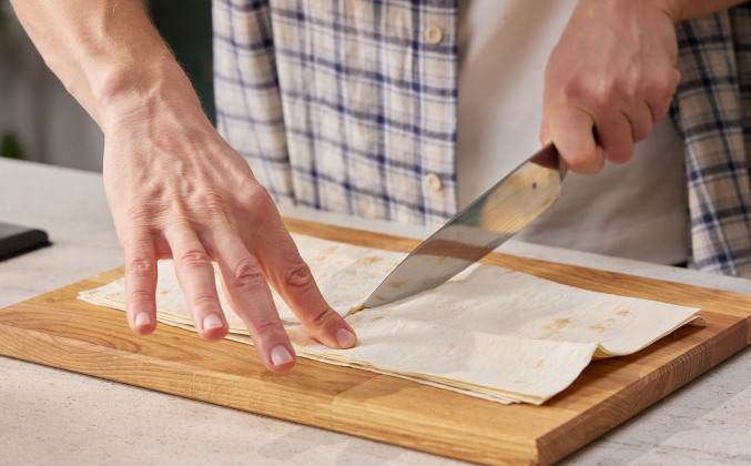 2. Каждый квадрат из лаваша смазать равномерным слоем фарша с овощами, накрыть вторым квадратом из лаваша и слегка спрессовать, смазать верхний лаваш фаршем. Таким образом выложить слой за слоем смазывая лаваш фаршем. Разрезать стопку из 8 слоёв пополам и одну половину переложить на вторую, слегка спрессовать. Разрезать стопку из 16 слоёв опять пополам. Одну половину насквозь проткнуть 6 шпажками с одинаковыми расстояниями друг от друга, затем прорезать ножом посредине между шпажками, так чтобы получилось 6 заготовок.