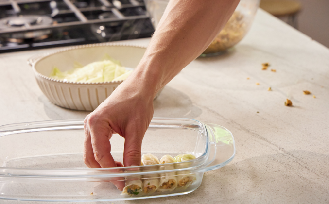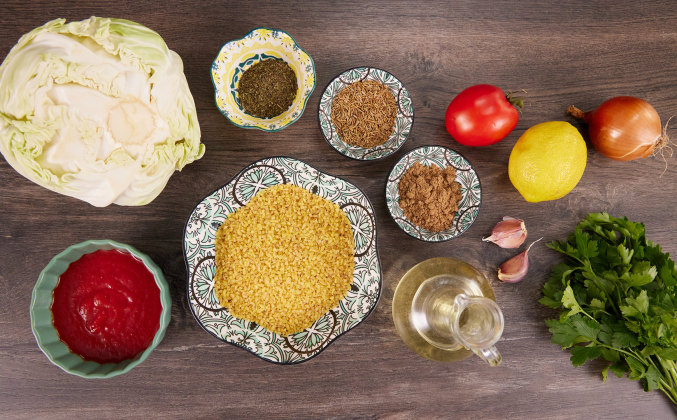 2. К овощам добавить зиру, тмин и сушёную мяту, обжарить и переложить обжаренные овощи в большую миску. Добавить готовый булгур и хорошенько перемешать. Нарезать капустные листья на квадраты (со сторонами 10-15 см) и отправить в кипящую воду на несколько минут, пока не станут мягкими. В каждый зашпаренный капустный лист завернуть начинку в трубочки. Выложить все трубочки с начинкой плотно в форму для запекания с высокими бортами.