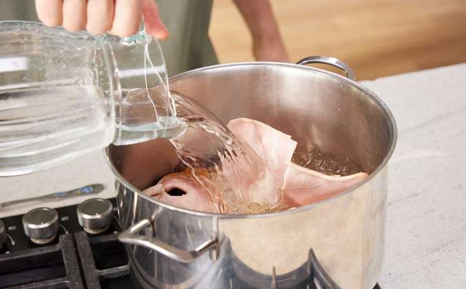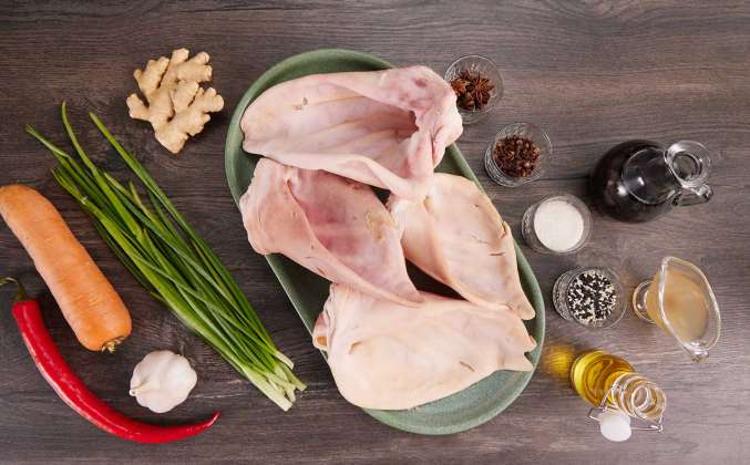 1. Заранее разморозить уши, опалить с помощью газовой горелки лишние волоски и хорошенько промыть. Отправить уши в кастрюлю и закинуть специи: бадьян, гвоздику, сахар, влить яблочный уксус и соевый соус (150 мл), добавить неочищенную разрезанную пополам головку чеснока и тонко нарезанные слайсы имбиря. Залить водой, чтобы покрыло уши.