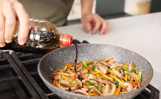 4. Обжарить ещё пару минут и в конце влить 30 мл соевого соуса, перемешать и снять с нагрева. Сервировка: Переложить на сервировочную тарелку уши с овощами и посыпать кунжутным миксом.Просто Кухня рецепты с 2020-2022