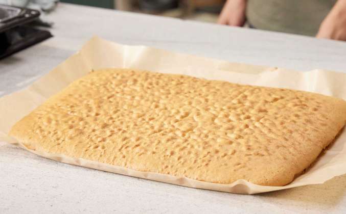 3. Готовому бисквиту дать полностью остыть. Отрезать неровные и подсохшие края бисквита. Нарезать бисквит на небольшие квадратики. Обрезки бисквита перебить в куттере до мелкой крошки. Отправить квадратики в сметанный соус, аккуратно перемешать, так чтобы они полностью пропитались кремом.
