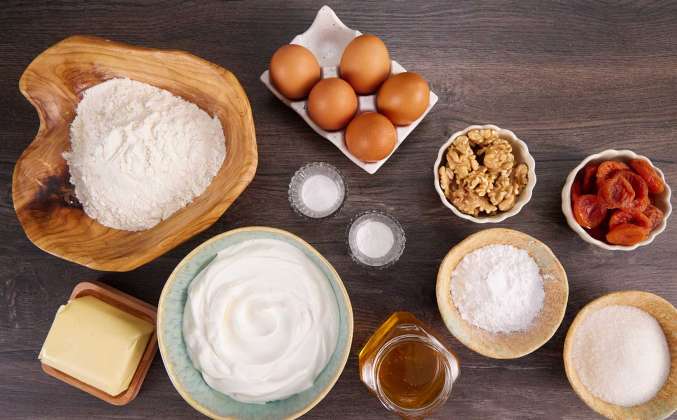 2. Застелить противень пергаментным листом и перелить на него тесто, равномерно распределить по поверхности листа. Отправить в заранее разогретую до 180 градусов духовку на 15 минут. Сметану смешать с сахарной пудрой, отложить в отдельную миску 3 ст. л. сметанного крема (для финального смазывания торта). Добавить в основную массу сметанного крема, мелко нарезанные курагу и грецкие орехи.