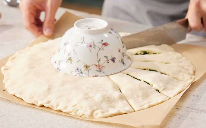 3. Переложить начинку на пласт теста на пергаменте и распределить отходя от краёв 1-1,5 см, накрыть вторым пластом теста и хорошенько скрепить по краям. Положить на центр пирога небольшую миску, наметив середину цветка. Прорезать тесто с начинкой ножом до миски на лепестки равной ширины. Убрать миску и аккуратно переложить на противень вместе с пергаментом.