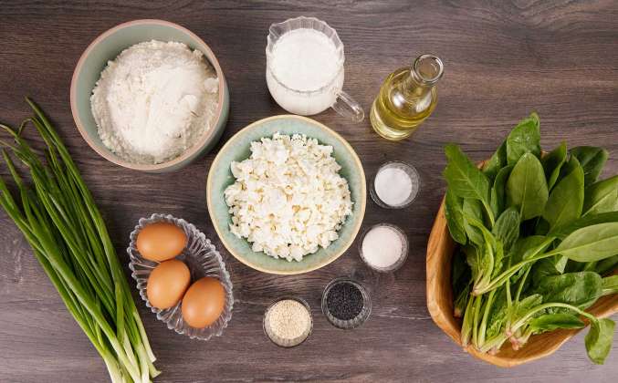 2. Зелёный лук: белую часть нарезать мелко и чуть крупнее зелёную часть. Нарезать шпинат на средние кусочки и смешать с луком, отправить к творогу. Посолить по вкусу и перемешать до однородности. Тесто разделить на две части. Одну часть убрать под полотенце. На подпыл на стол насыпать 10 г муки, раскатать 1/2 теста в круглый пласт средней толщины и переложить на пергамент. Вторую ½ теста с подпылом муки (10 г) раскатать в такой же круг, как первый.