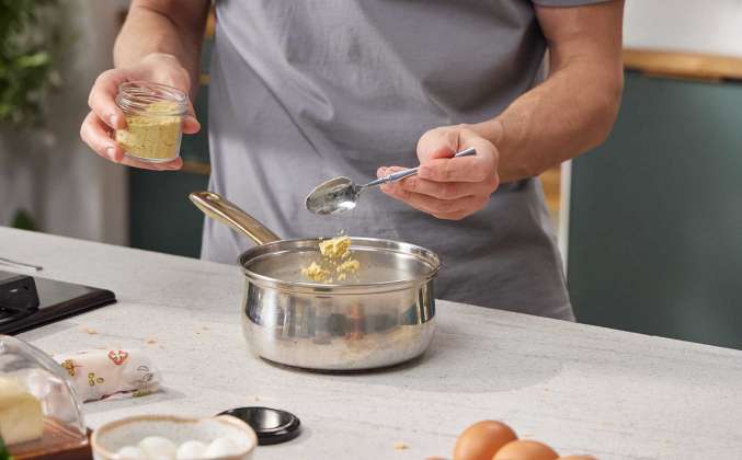 1. Рис залить водой (500 мл) (1 стакан риса к 2 стаканам воды), добавить щепотку соли и варить на минимальном нагреве пока не выпарится вся вода, периодически помешивая. Горбушу разделать: убрать плавники, прорезать по спинке и удалить шкурку, разобрать рыбу на средние кусочки. Молоко перелить в сотейник и добавить 1 ч. л. с горкой горчичного порошка, муку и щепотку соли, сливочное масло (20 г).
