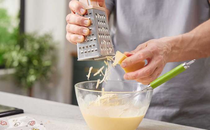 2. На минимальном нагреве заварить до небольшого загустения, активно перемешивая венчиком. Перелить полученную массу в отдельную миску и добавить 2 яйца, перемешать венчиком, а затем разбить ещё 2 яйца, перемешать венчиком до однородности. Натереть сыр в заливку, добавить мелко нарезанную петрушку и перемешать.