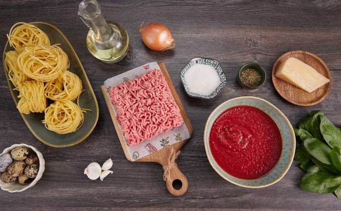 2. Протёртые томаты посолить по вкусу, добавить измельчённые зубчики чеснока, прованские травы, мелко нарезанный лук и влить воду 300 мл (1к1 с протёртыми томатами), хорошенько перемешать. На большую сковороду с высокими бортами налить 20 мл подсолнечного масла, выложить 7 сухих макарон-гнёзд. Вокруг гнёзд налить ½ томатного соуса и в каждое гнездо положить по фаршированной тефтеле, накрыть крышкой и томить на медленном нагреве 20 минут.