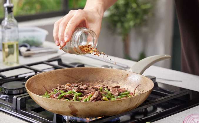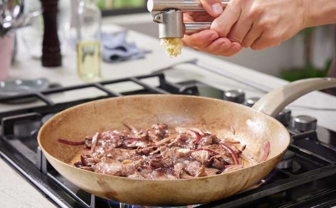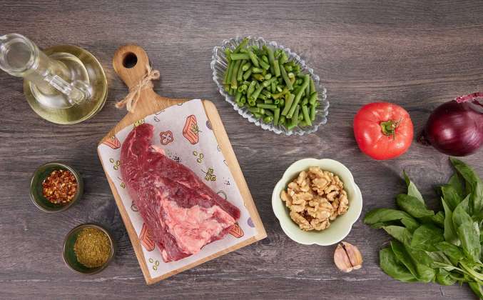 2. Добавить к мясу с луком измельчённый чеснок. Фасоль заранее разморозить и отправить к мясу. Добавить к мясу с фасолью хлопья чили перца и хмели-сунели, посолить по вкусу. Помидор нарезать на дольки, вырезать семенные коробочки и нарезать соломкой помидорные дольки с кожицей, отправить к мясу в самом конце приготовления.