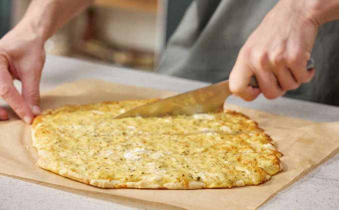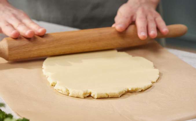 2. Тесто на пергаменте раскатать в тонкий прямоугольный или квадратный пласт, оставляя на пергаменте переложить на противень. Переложить начинку на тесто, распределяя по всей поверхности, не отходя от краёв. Отправить в заранее разогретую до 180 градусов духовку на 17 минут. Дать остыть в течение 10 минут и нарезать на квадратные кусочки.
