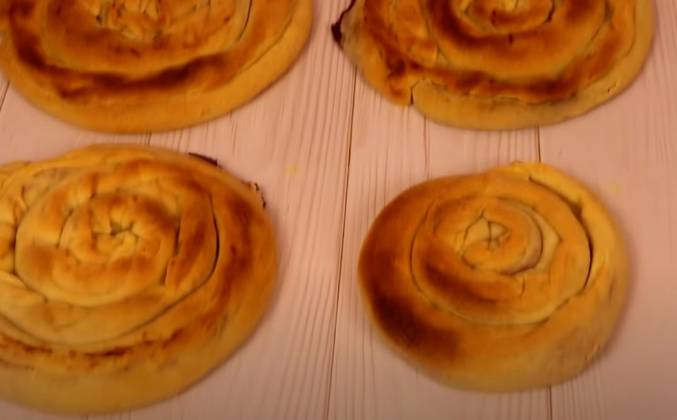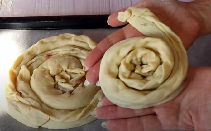 3. Слежу, чтобы не осталось не склеенных промежутков, чтобы начинка не вытекла. Перекладываю эту заготовку-трубочку на пергамент. В моем случае я укладываю ее по спирали. Следующую трубочку я прикладываю к концу предыдущей и таким образом делаю корж нужного мне диаметра. Итак, я накрутила вот такие спирали, разного диаметра. А в классической сборке из всей порции теста у вас получатся 16 трубочек длинной 20 см.