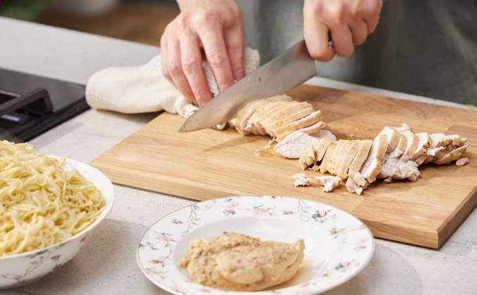 3. Отправить готовые яйца в холодную воду, очистить от скорлупы. После 20 минут отваривания курицы влить в бульон соевый соус, довести до кипения, накрыть крышкой и снять с нагрева. Убрать через 5 минут курицу из бульона и нарезать её слайсами средней толщины. Отправить в кипящую воду лапшу и варить 2 минуты. Нарезать мелко зелёный лук, а кунжут обжарить на сухой сковороде.