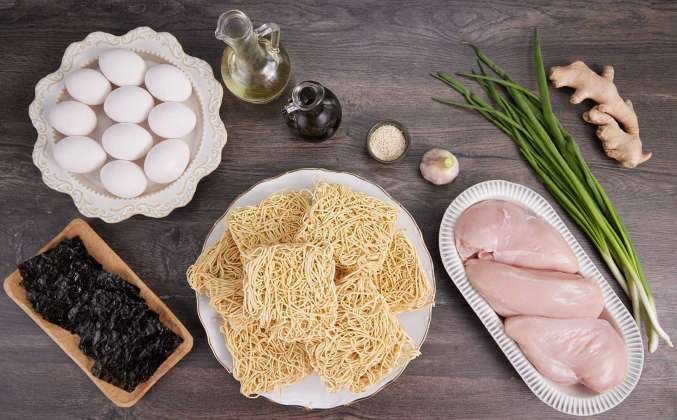 4. Сервировка: В каждую порционную супницу выложить лапшу, затем слайсы курицы и залить бульоном. Разрезать яйца пополам и по 2 половинки яиц выложить в каждую супницу. Украсить зелёным луком, листьями нори и кунжутом.Просто Кухня рецепты с 2020-2022