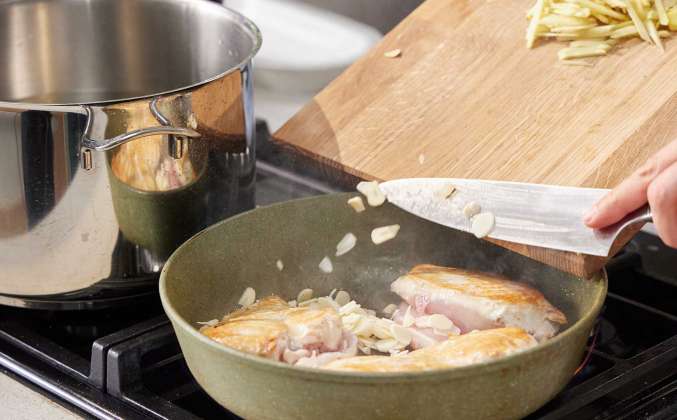 2. Варить на среднем нагреве под крышкой в течение 20 минут после закипания. Совет от шефа: Курицу надо слегка переварить, а затем убрать из бульона, таким образом курица останется вкусная, а бульон насыщенным В отдельном большом сотейники довести воду до кипения, обильно посолить, уменьшить нагрев и отправить яйца в сотейник. Мелкие яйца на 5 минут, а крупные на 6 минут, то есть в среднем варить 5,5 минут.
