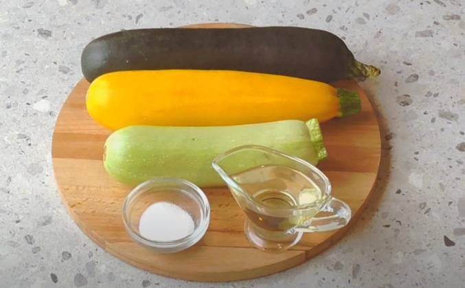 Давайте приготовим жареные кабачки на сковороде без кляра и без муки. Нам потребуется растительное масло без запаха, соль и сами кабачки. У меня сегодня желтые кабачки, зелёные кабачки и цукини.