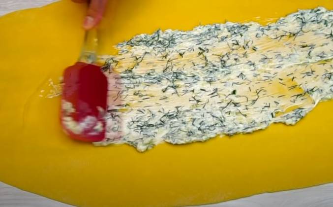 4. Зелень укропа мелко порубим и добавим к мягкому сливочную массу, примерно 40 грамм, чеснок 4-3 зубчика измельчаем, перемешиваем. Тесто раскатываем в тонкий пласт, для удобства можно разделить на две равные части, смазываем маслом с чесноком и заворачиваем рулет.