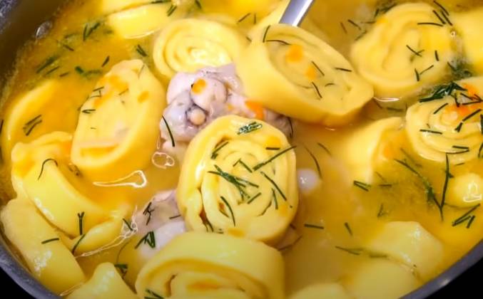 5. Плотно закрепляем край, нарезаем на рулетики. Получившиеся рулетики опускаем в кастрюлю и варим до готовности минут семь-десять, даём супу настояться минут 10 и можно подавать к столу.Видео рецепт ютуб ниже 👇
