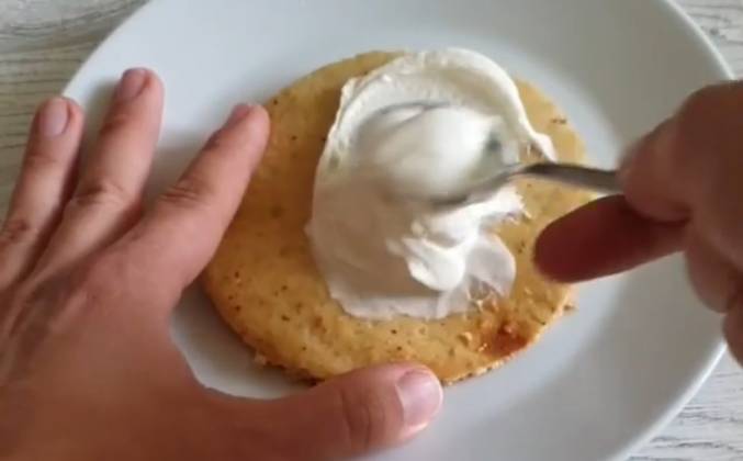 2. В духовку на 180С - 15 минут на 180С. Дать кожу полностью остыть и снять с пергамента. Кольцом диаметром 10 см вырезать 4 коржика.