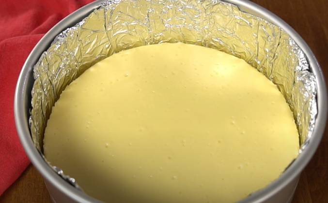 2. Добавляйте яйца по одному, медленно перемешивая после каждого добавления. Вылейте жидкое тесто в форму для выпечки. Поместите форму в другую большую форму или кастрюлю. Автор использует большую форму для кекса, но вы можете использовать форму для запекания или любую другую большую форму для выпечки. Заполните внешнюю форму достаточным количеством теплой воды, примерно на половину от уровня чизкейка.