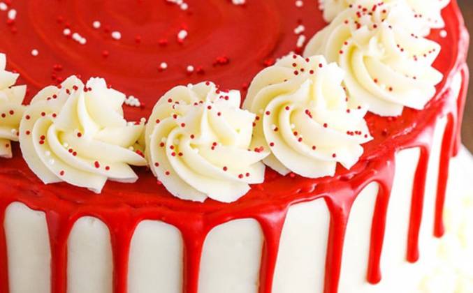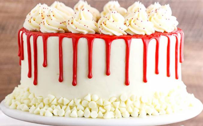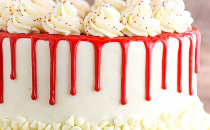 7. Выровняйте торт оставшимся кремчизом. Если вы собираетесь украшать торт дополнительно розочками, как на фото, то оставьте кремчиз еще и для этого. Декор. Ориентируемся по фото. Нанесите белую шоколадную стружку (капли) в нижней части торта, вокруг.Поставьте в холодильник на 20 минут. Чтобы сделать красный ганаш, поместите красный шоколад в небольшую миску. Нагрейте сливки до тех пор, пока они не закипят, а затем залейте шоколад. Подождите 1-2 минуты и перемешайте с помощью венчика и или лопаточки. Если он не полностью расплавлен (и, вероятно, не будет), нагревайте его еще 20-30 секунд, взбивая до однородного состояния.