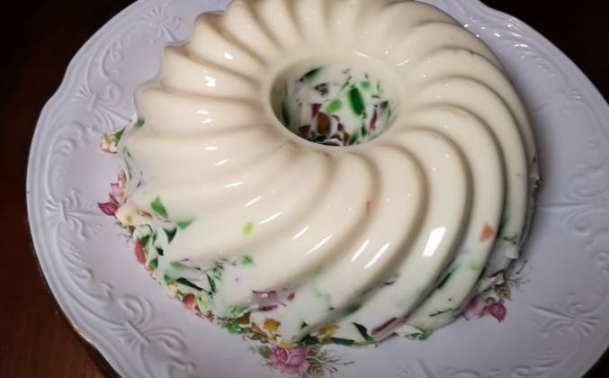 4. В данном случае вот эту форму в которой я обычно пеку шарлотку заливаем и даем ему остыть. Прошло полтора часа желе застыло подрежем немножечко края и будем выкладывать его на блюдо которое будем оформлять снимаем вот, и приступаем к оформлению сначала мы нарежем тонкими ломтиками апельсин, сейчас каждый кружочек для серединки надрезаем и укладываем вокруг нашего тортика. Восьмерочками, сделали восьмёрочку уложили апельсин, уложим каждую дольку апельсина , возможно положить еще чернослив, будет контраст белые и черные - тоже будет невероятно красиво. Наше блюдо готово, мы постарались и получилась красота. Сейчас отрежем лакомый кусочек и попробуем его на вкус, в разрезе как же он будет выглядеть, вот так выглядит наш торт.Видео рецепт ютуб ниже 👇