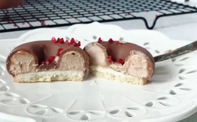 3. Часть печенья обязательно оставляйте, так будет удобнее взять в руки готовый пончик! Отправляем в морозилку. Крем должен полностью замерзнуть. Извлекаем заготовки из формы. Делаем глазурь для пончиков из шоколада: глазируем предварительно затемперированным шоколадом или поступаем как я: 130 г молочного шоколада растопить и добавить 13 г растительного масла.