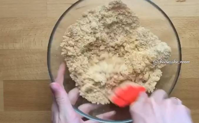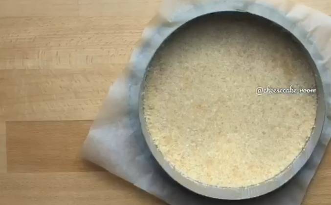 2. Сформировать дно из крошки, без бортиков, разровнять ложкой. Поставить в духовку и выпекать до 10 минут, до румяности. Вынуть немного охладить.
