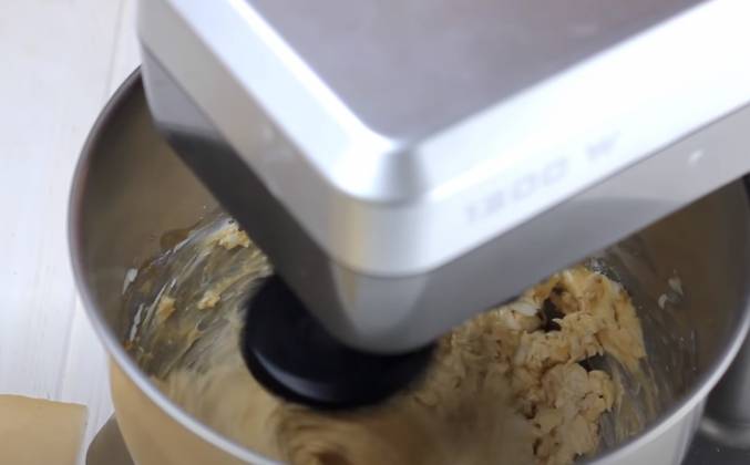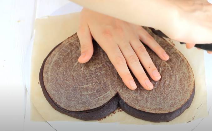 2. Муку добавляем за 2-3 приема и перемешиваем венчиком. Тесто получится довольно плотное, нам как раз такое и необходимо, чтобы придать коржам форму и выпекать просто на пергаменте. Вырезаем шаблон сердца. Кладем пергамент на противень и обводим наш шаблон, у меня поместилось 2 шт. Отсаживаем наше тесто при помощи кондитерского мешка на пергамент. Толщина коржа должна получиться примерно 1 – 1,5 см, из всего теста у меня получилось 3 коржа, тесто я выпекала за 2 приема. Выпекаем в разогретой до 170 градусов духовке 15 минут. Отделять бисквит от пергамента необходимо когда он полностью остыл, иначе если делать это сразу,то он поломается. Немного подрезаем край бисквита.