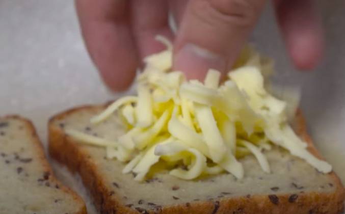 2. Хотите два сэндвича — кладите два кусочка. На них хороший такой слой сыра, но при этом не весь который вы натерли — он нам еще понадобится. Ну а если хотите добавить немного элегантности — добавьте смесь молотого черного перца. Накрываем сверху вторым кусочком хлеба и сверху еще немного сыра, но меньше чем в середину. На умеренном огне жарим 3-4 минуты пока не подрумянится низ, а сыр сверху немножко расплавится. Добавим немножко масла в сковороду и можно переворачиват сэндвичи.
