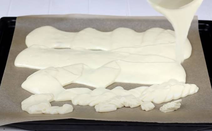 2. Взбиваем оставшиеся белки от 4х яиц. Ничего к ним добавлять не нужно. Белки должны получиться очень плотные и держаться в тарелке при переворачивании. Аккуратно добавляем к смеси желтков и муки взбитые белки. Добавляем за 2-3 приема вымешивая лопаткой снизу вверх.Застилаем пергаментом противень и выкладываем на него наше тесто. Размер противня 40х30. Выпекаем в разогретой до 180 градусов духовке 12 минут. Готовый бисквит достаем из духовки и укладываем на чистый пергамент лицевой стороной, убираем пергамент на котором выпекался бисквит.