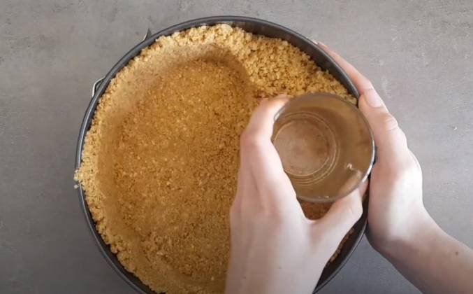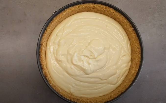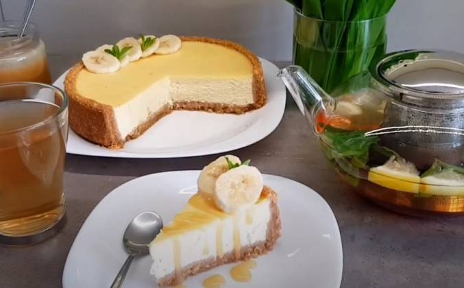 3. Получается кремообразная масса, достать из морозилки основу и вылить в нее массу, слегка покрутить форму чтобы поверхность выравнялась, разогреть духовку до 180 градусов, выпекать чизкейк на водяной бане. Для этого на дно духовки поставить форму с водой, а выше разместить чизкейк, выключить духовку и оставить в ней чизкейк на пару часов. Достать, подождать пока полностью остынет и поместить в холодильник на ночь, аккуратно снять бортик, украсить бананом и мятой, резать горячим мокрым ножом, полить карамельным соусом, чизкейк получается очень нежным сливочным, просто тает во рту, наслаждайся вкусом.Видео рецепт ютуб ниже 👇