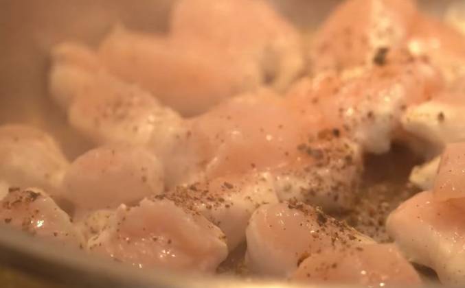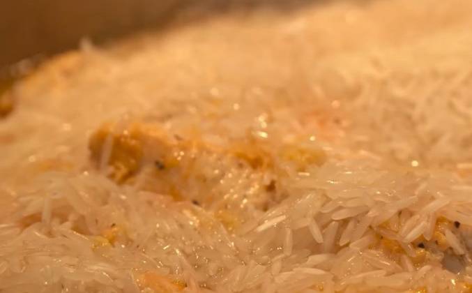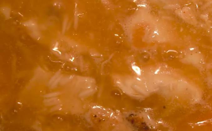 2. Перемешайте курицу и убегайте натирать имбирь. Одна столовая ложка уже натертого, ну небольшой такой кусочек. А если любите имбирь — можно и больше. Кстати, можете его и не чистить — в кожице довольно много полезных веществ, но не забудьте помыть. Также начистим и нарежем 3-4 зубчика чеснока. Ну сколько там то куриное филе выжаривать? Ваша же задача добиться вот этой карамельной штуки. И затем скидываем уже чеснок и натертый имбирь в сковороду. Помешаем слегка. Сразу почувствуете этот запах. Ммм.. Но потерпите! Будет еще вкуснее. Для этого отмерим 1 стакан риса. Если в граммах — ровно 200. Добавляем ровно в 2 раза больше воды, то бишь 2 стакана. Ну 2:1, вы же знаете.. И сразу смотрите какого цвета становится вода от карамели — вот же где весь вкус!