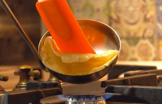 2. Ну и в конце добавляем чайную ложку муки или крахмала. Ну для скрепления. А можете вообще не добавлять. Хорошенько взбиваем вилкой. Ну так.. чтобы по максимуму избавиться от комков. И вперед к плите. К газовой которая, ага. Разогреваем над огнем черпак. Даа.. советую брать старый. Плюхаем ложку масла туда, размазываем его по стенкам. Ну вы понимаете, да? Чтобы яйцо не прилипло. Ну и наливаем немножко яичной смеси. Крутим черпаком влево, вправо, вверх, вниз, образовывая блинчик. Если ляпнули много яйца, ну вылейте лишнее обратно.