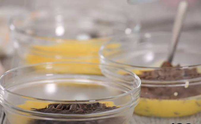 2. Готовность бисквита проверить деревянной шпажкой, если при прокалывании она выходит чистой из бисквита — значит он готов. Готовый бисквит вынуть из духовки и дать остыть в течение 10 минут. Затем вынуть из формы и остудить на решетке. Приготовить мусс. В каждую миску насыпать по 6 грамм желатина и залить его по 35 мл холодной воды. Хорошо перемешать и оставить на 10 минут.