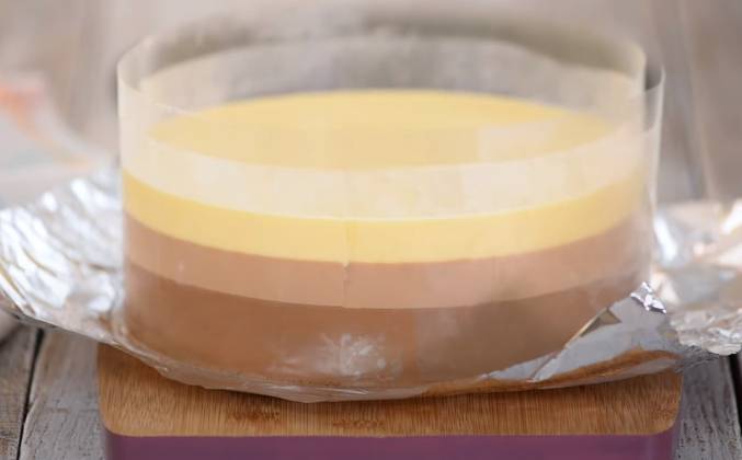 5. Дно кондитерского кольца диаметром 21 см затянуть фольгой или полиэтиленовой пленкой. Стенки формы проложить бумагой для выпечки или кондитерской ацетатной плёнкой. Положить кольцо на ровную поверхность, например разделочную доску. В середину, на дно кольца положить бисквит, сверху вылить мусс из темного шоколада и убрать в холодильник на 20 минут. Подготовить мусс на молочном шоколаде. Разбухший желатин растопить в микроволновке или на водяной бане.