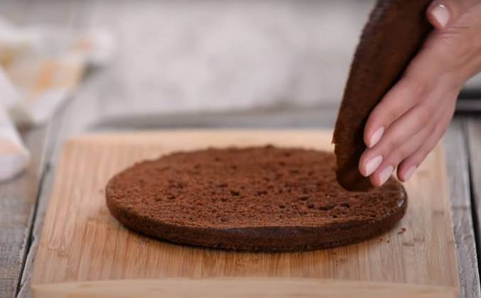 4. Охлажденные сливки взбить миксером до крепких пиков. Разбухший желатин растопить в микроволновке или на водяной бане. В миску с темным шоколадом добавить растопленный желатин и хорошо перемешать, затем добавить 150 грамм взбитых сливок и перемешать до однородности. (Оставшиеся взбитые сливки лучше хранить в холодильнике). Срезать верхнюю часть бисквита.